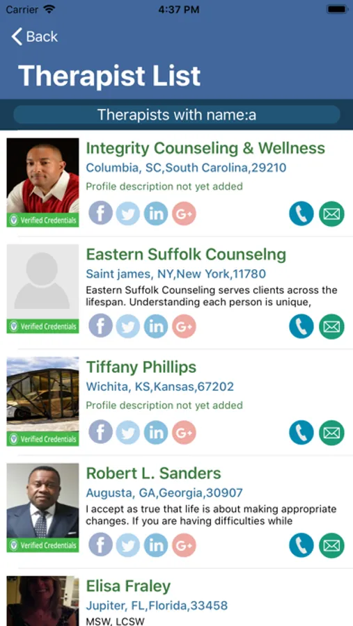 Find a Therapist is a free service that helps individuals find therapists based on publicly available data on the Internet by various search criteria including Current GPS coordinates, Zip Code, Specialties. The app shows a list of 50 Therapists selected from all the therapists in the system based on the selection criteria. Therapists currently not listed in this free directory can contact TherasoftOnline.com to be added to the free directory.