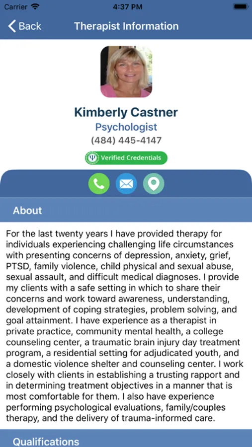 It also allows you to select a Therapist and view their detailed introductory narrative or locate them on the map and get turn by turn directions using the built-in Maps app.