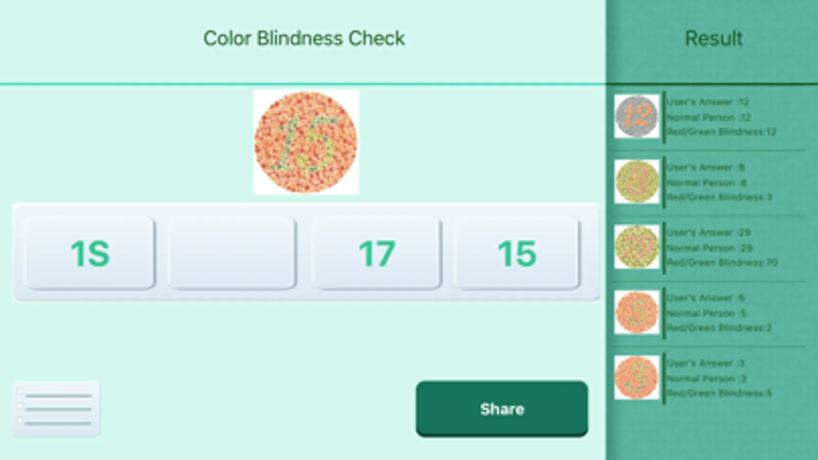 Color vision deficiency is defined as a lack of perceptual sensitivity to certain colors. Certain people cannot make out the difference between some couples of complementary colors. In this check (known as Ishihara Color Test) you are provided with series of pictures of colored spots. A figure is embedded in the picture as a number. You need to identity the number and select the appropriate answer from the options given besides the picture. The result card is generated showing your answer compare to the answer of a person with normal vision. You can share your result card with your doctor.