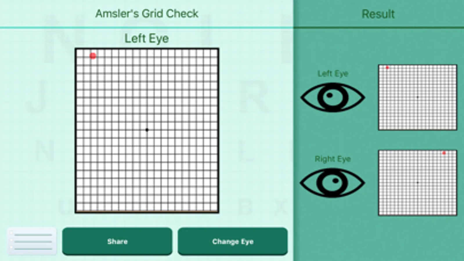 This check is designed to detect any kind of visual disturbance which may be caused by some changes in retina, optic nerve or the visual pathway to the brain. Look at the grid with each eye separately at the small dot in the center of the grid. Mark the grid if you see any wavy lines or some missing lines. The result of each eye is stored in iPhone device and can be referred by doctor to diagnose the actual location of problem. This check helps to diagnose any macular disease in the eyes.