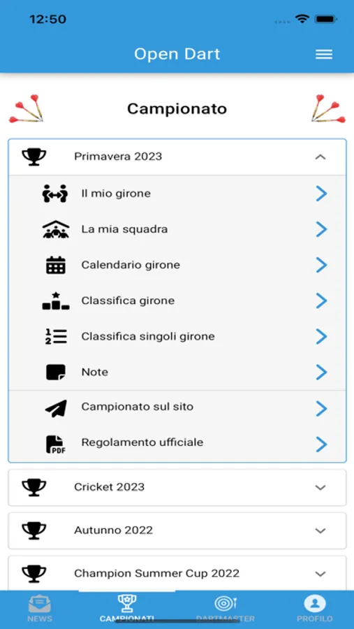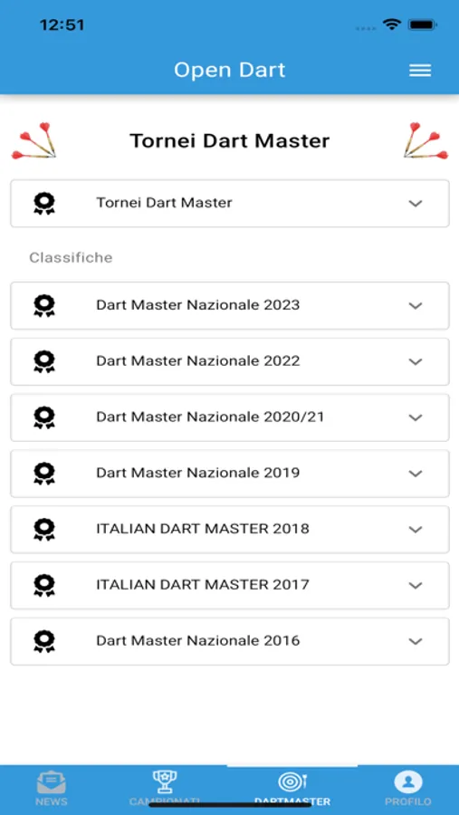 OpenDart garantisce un’attività dinamica, copiosa di opportunità, con campionati a squadre e tornei individuali, riservati a quelli che già vi fanno parte e a quelli che lo faranno, incoraggiati senz’altro dai nostri presupposti e dal nostro forte esorto ad unirsi!