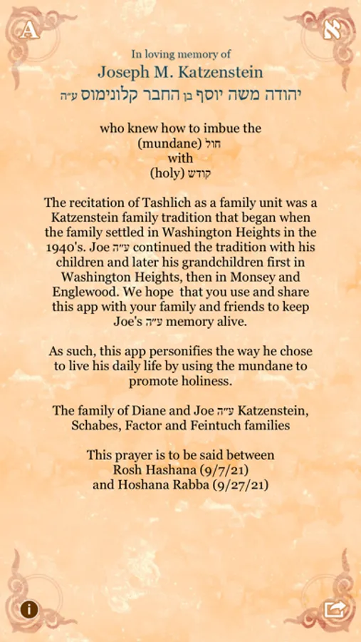 The recitation of Tashlich as a family unit was a Katzenstein family tradition that began when the family settled in Washington Heights in the 1940's. Joe ע״ה continued the tradition with his children and later his grandchildren first in Washington Heights, then in Monsey and Englewood. We hope that you use and share this app with your family and friends to keep Joe's ע״ה memory alive.