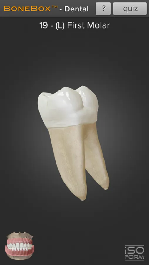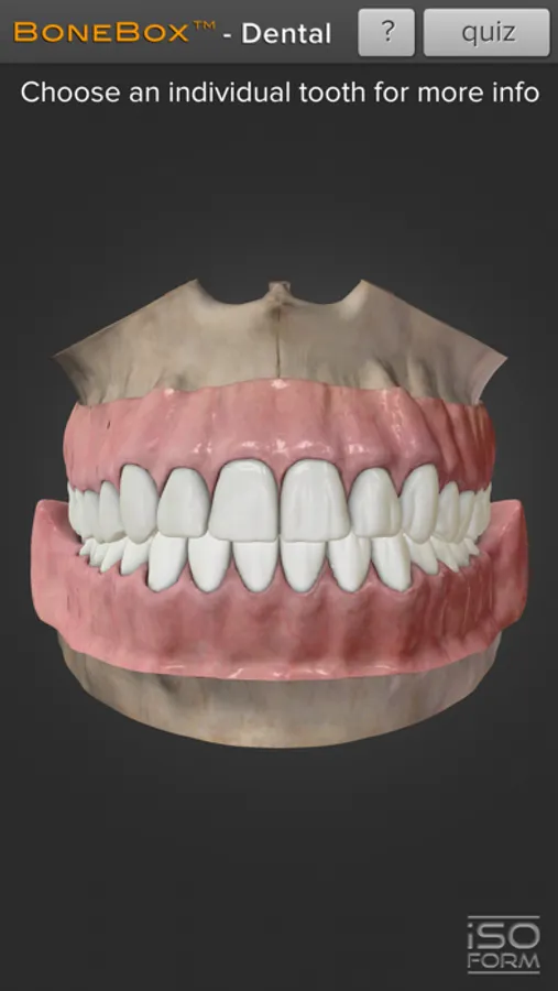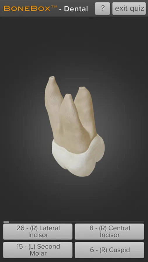 Interaction with BoneBox™ - Dental Lite utilizes true real-time 3D so the user can place the highly realistic detailed dental anatomy in any position and zoom in to explore all of the anatomical structures. By using the interactive quizzing feature the user will be tested on their knowledge of the human dental anatomy. The user is presented with a random tooth and given 4 multiple choice answers to pick from.