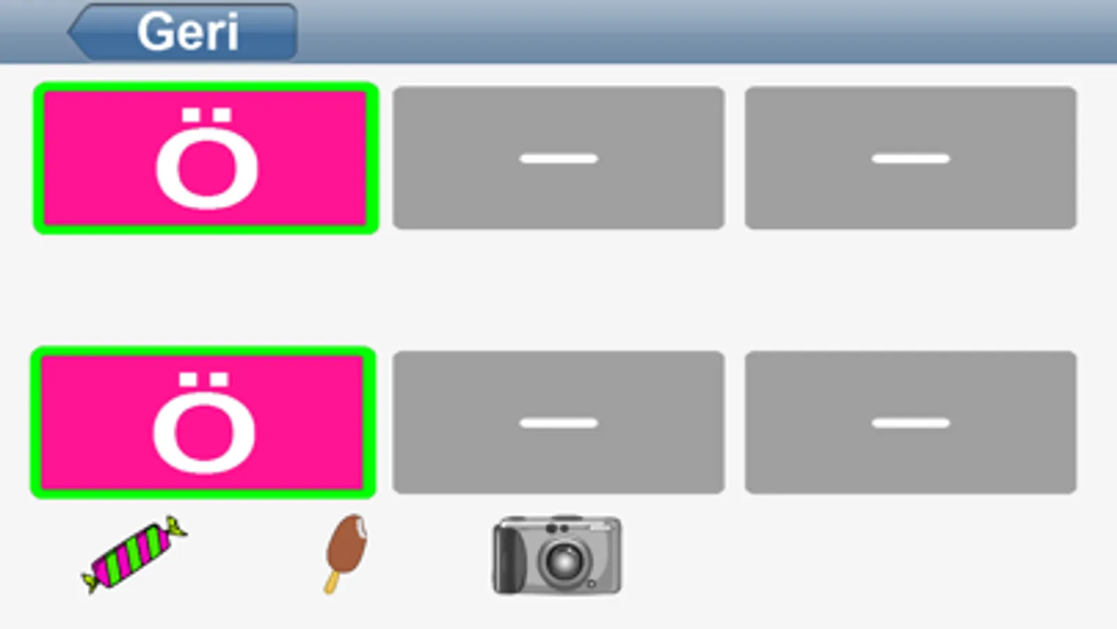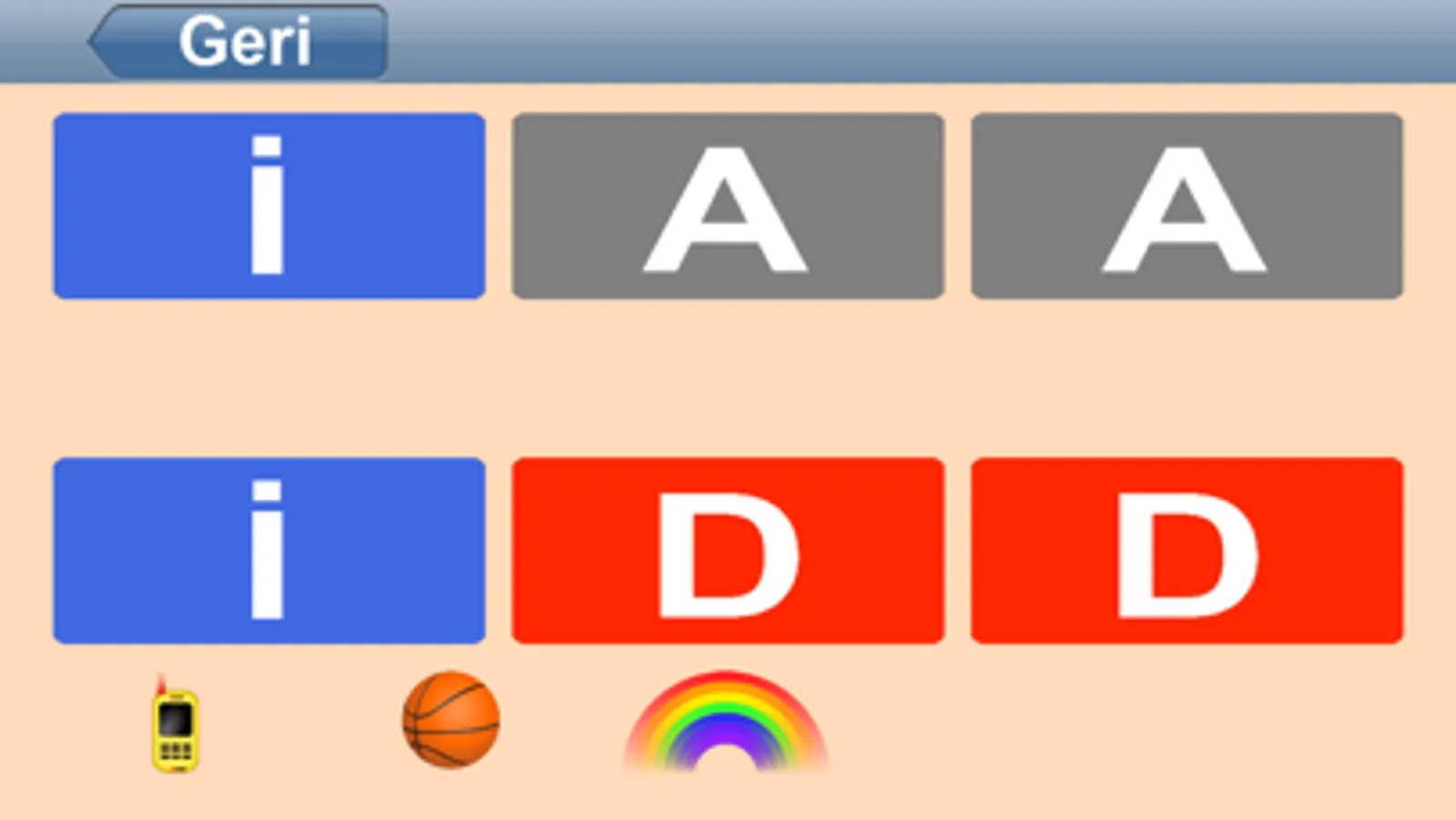 2. Aynı Renkte Eşleştirme - Daha zor bir seviyedir. Bütün kartlar aynı renktedir. Çocuk sadece harf tespiti ile eşleştirir. Kart rengi yardımı olmadan sembolleri eşleşen kartları seçin.