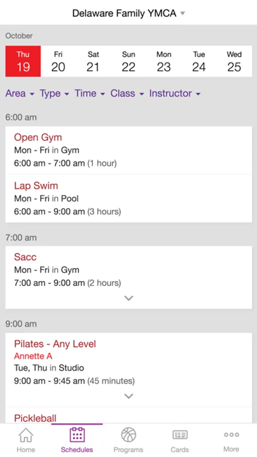 • Easily view schedules for each day and filter for the types of classes that you like.
