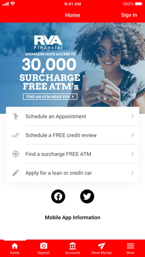 RVA Financial Mobile provides members convenient access to our website, mobile check deposit, mobile banking, branch and contact information.