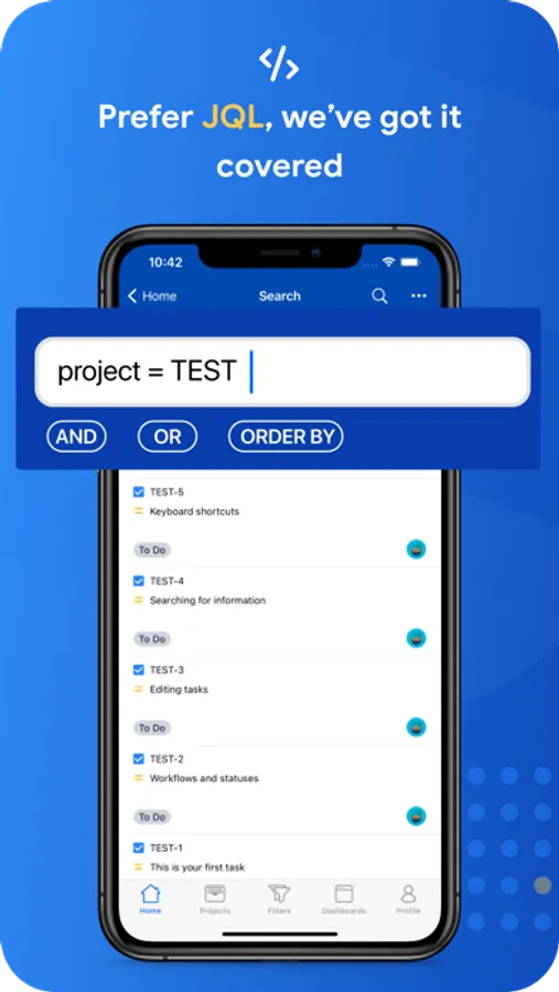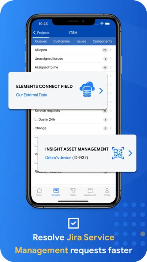 Move Jira issues and Jira Service Management requests forward – anytime, anywhere, any device (requires the Mobility for Jira add-on from the Atlassian Marketplace for full functionality for all users)