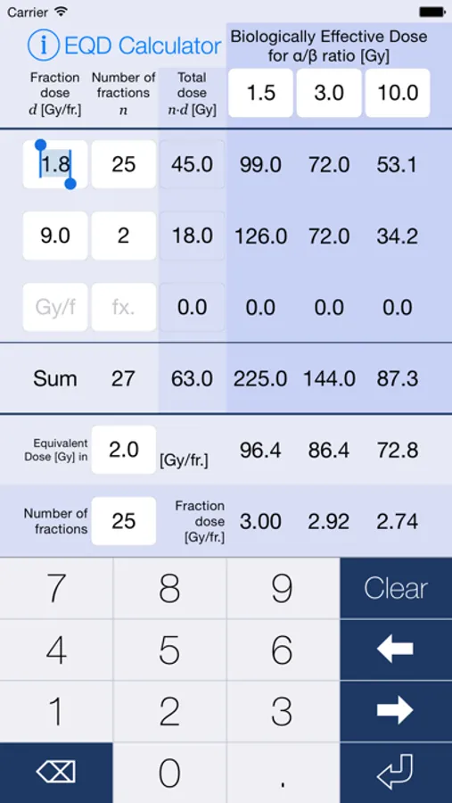 - This App can calculate these values together in three different conditions stated by three parameters (fraction dose or total dose, number of fractions and alpha/beta ratio), and summation of them automatically.