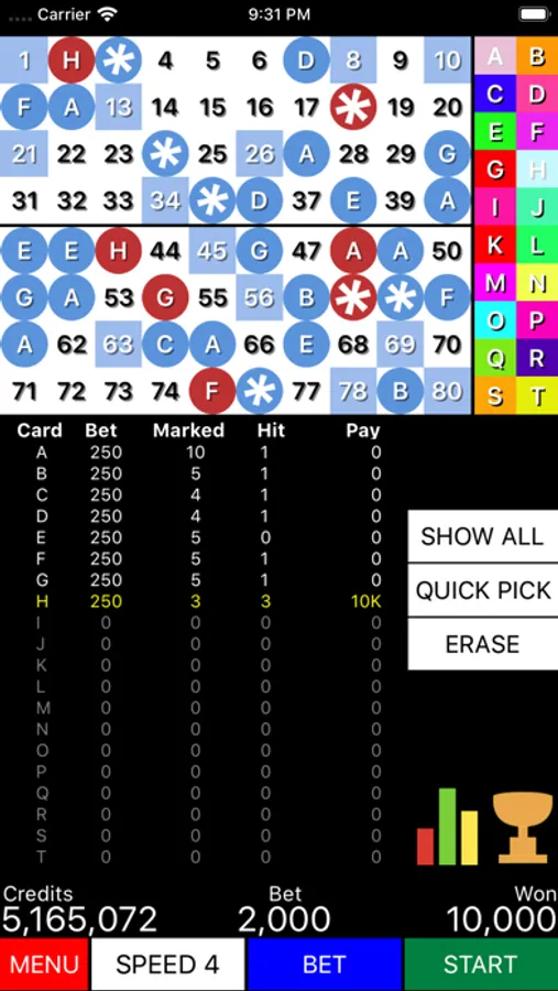 Keno is a fun number guessing game. Mark between 2 and 10 numbers per card, then place your bet, and press "Start." Twenty numbers are randomly generated and the more you match, the more you win!
