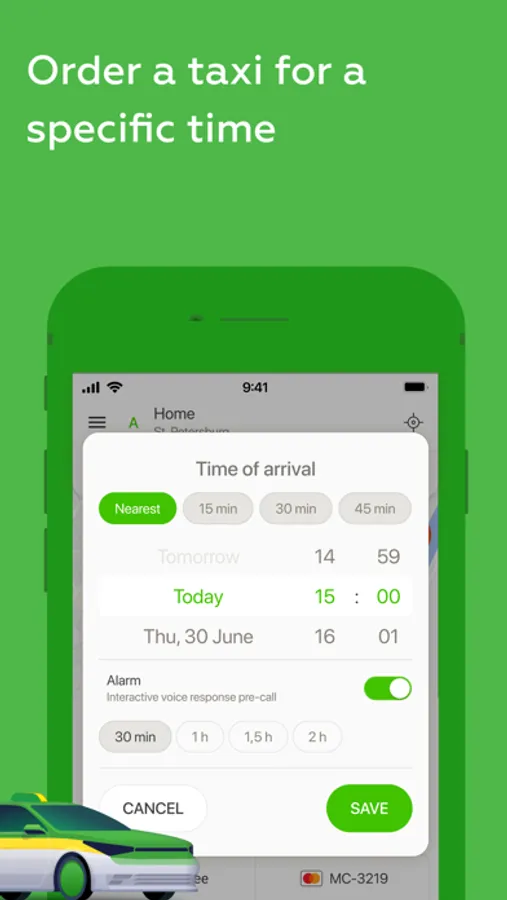 Do you need to call a taxi to the airport or train station? Create an order in advance! Indicate the required date and time in the “Delivery time” section. Turn on the “Alarm” option so that the auto-informant calls and wakes you up.