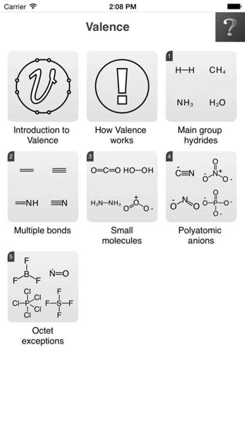 Chemical Valence is an app designed to help you learn the basics about chemical bonding. This app provides a fun game-like, intuitive interface in which you push valence electrons around to make molecules. If you form the correct 2D Lewis dot structure, you are rewarded with a rotatable 3D structure that helps you visualize the real geometry of the molecule. As your understanding grows, each level gives you more complicated structures to solve. Use the narrative, definitions and open-ended reflection questions (with hints!) to guide your understanding. This app is suitable for individual study or for use in a classroom.