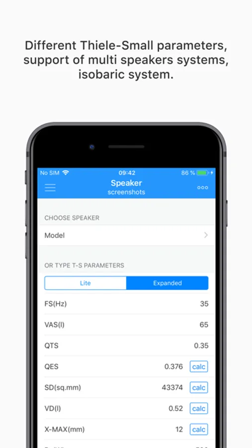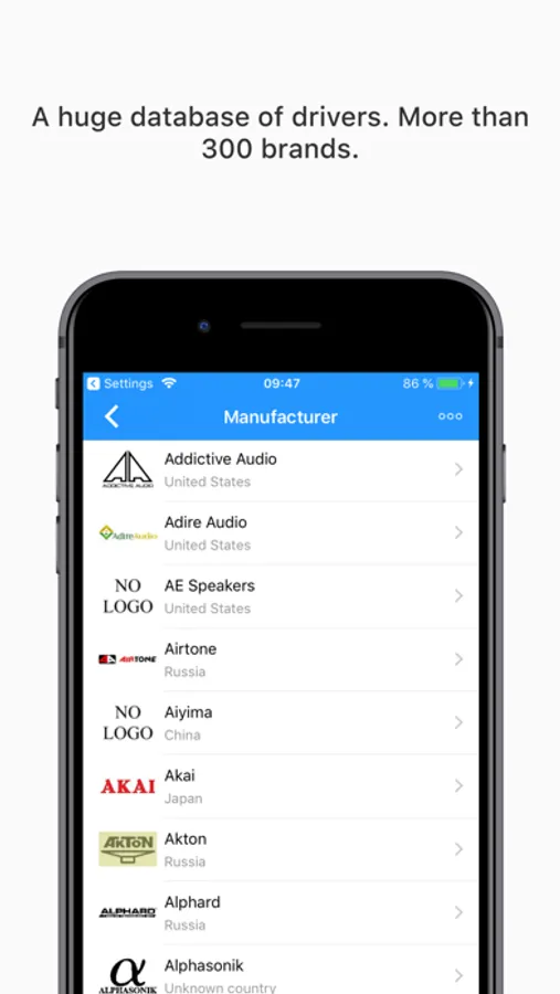 There is a shared on-line database of speakers(which contains about 5000 drivers), in which you can add your speakers and edit existing ones, and after it will review by a moderator it will be available to other users of «Speaker Box Lite».