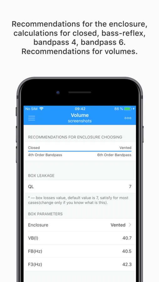 This app is designed for beginners and advanced fans of acoustic system building. The main feature is a calculation of the volume of the subwoofer box, according to his parameters Thiele-Small(FS, VAS, QTS). This is a list of features for box calculations: