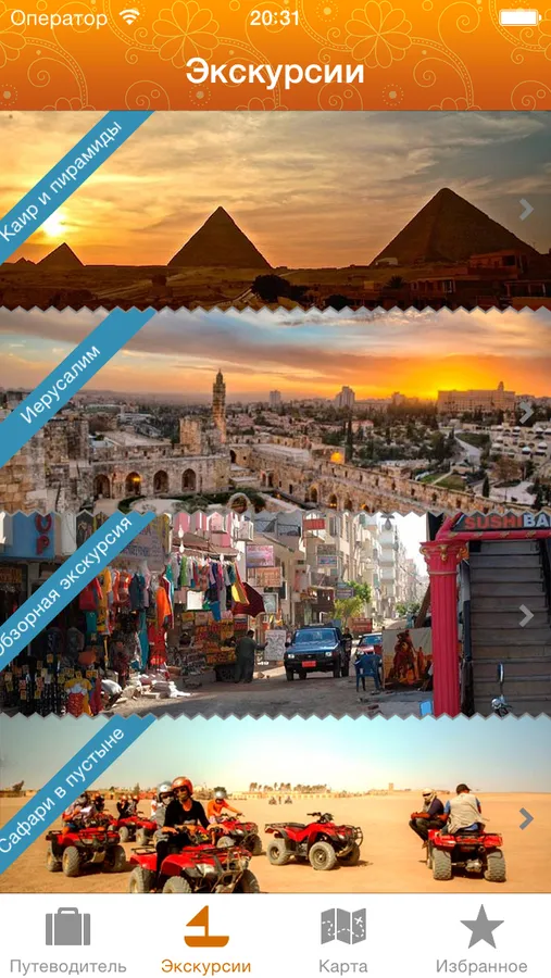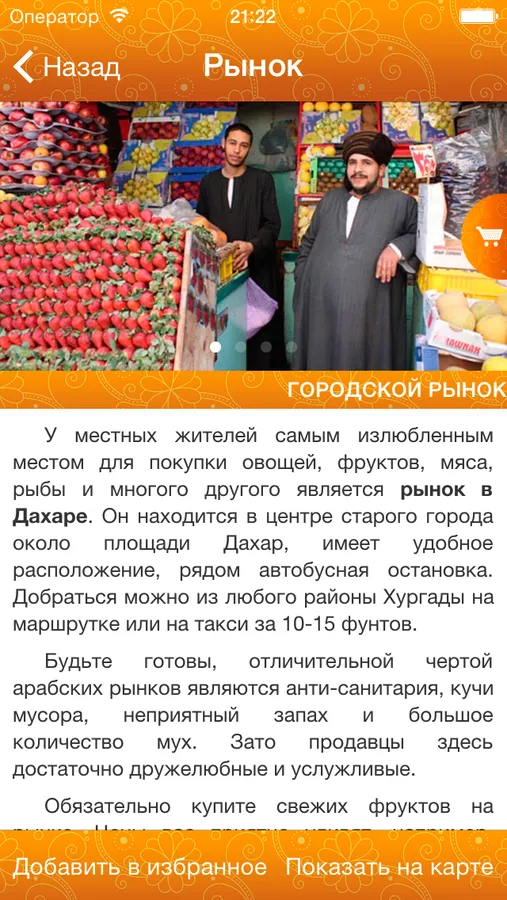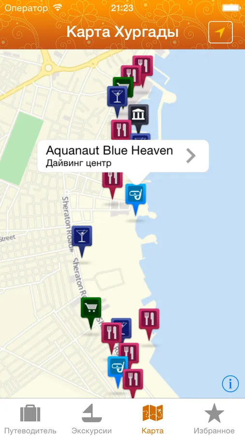 Отдых в Египте разнообразен и интересен, наше приложение поможет вам сэкономить время и деньги в вашем путешествии. В путеводителе вы найдете много полезной информации о ресторанах, магазинах, ночных клубах и других заведениях, а также сможете узнать о экскурсиях, отдыхе и достопримечательностях. Для работы приложения не требуется интернет, так что вы в любое время сможете посмотреть нужную информацию, открыть карту, найти ресторан или магазин.