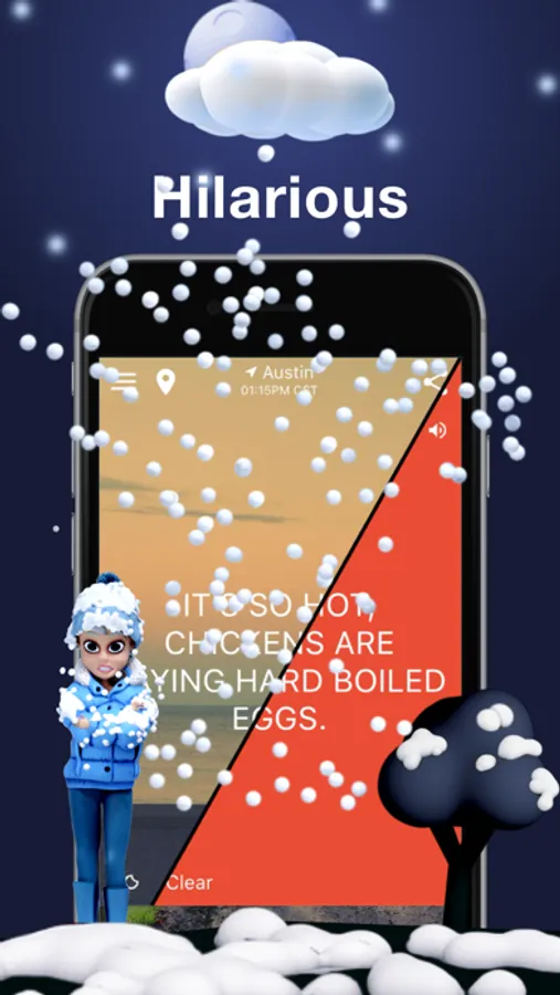 Start your day off on the right foot with HumorCast: the original funny weather app. Baked-in are 1000s of phrases ready to complement the awful weather. We also use a state-of-the-art weather engine including NOAA and wrapped it up in an easy-to-use interface. Oh, did we mention 100s of beautiful backgrounds taken by world-class photographers and paired precisely to each weather condition? And best of all, we make it easy-as-pie to share so you and your friends can LOL together.