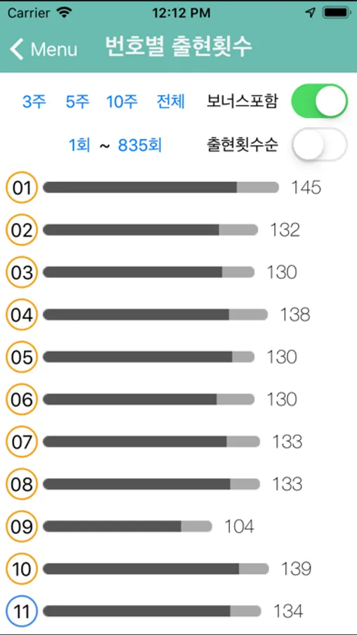 - 번호별 출현횟수( 3주, 5주, 10주, 전체에 대한 출현횟수 분석)