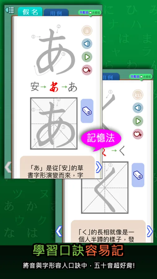 《五十音輕鬆學》利用記憶口訣,並強調利用字源、字形、字音聯想的方式,同時搭配書寫功能,讓您不但記得快,還可達到過目不忘的效果。