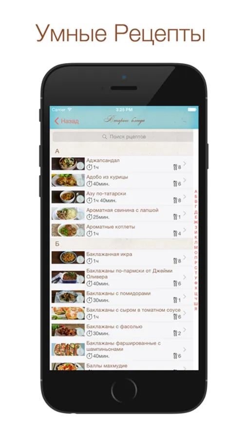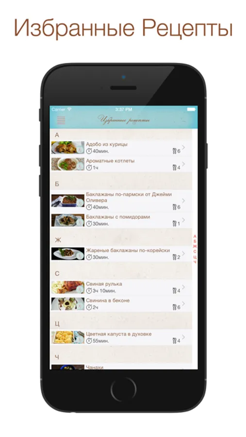 • Время приготовления, калорийность, ингредиенты и инструкции для каждого рецепта
