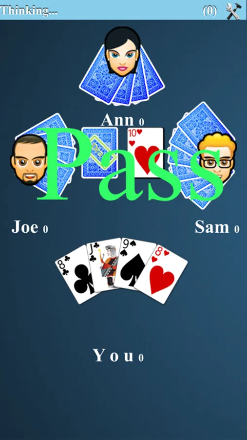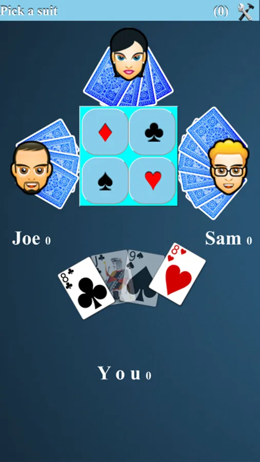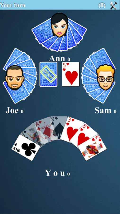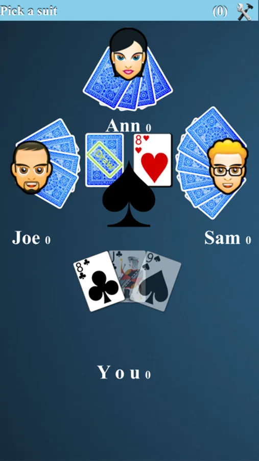 Players discard by matching rank or suit with the top card of the discard pile, starting with the player left of the dealer. If a player is unable to match the rank or suit of the top card of the discard pile and does not have an eight, he
