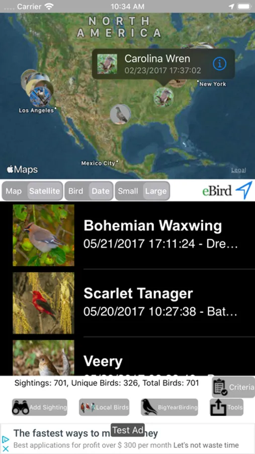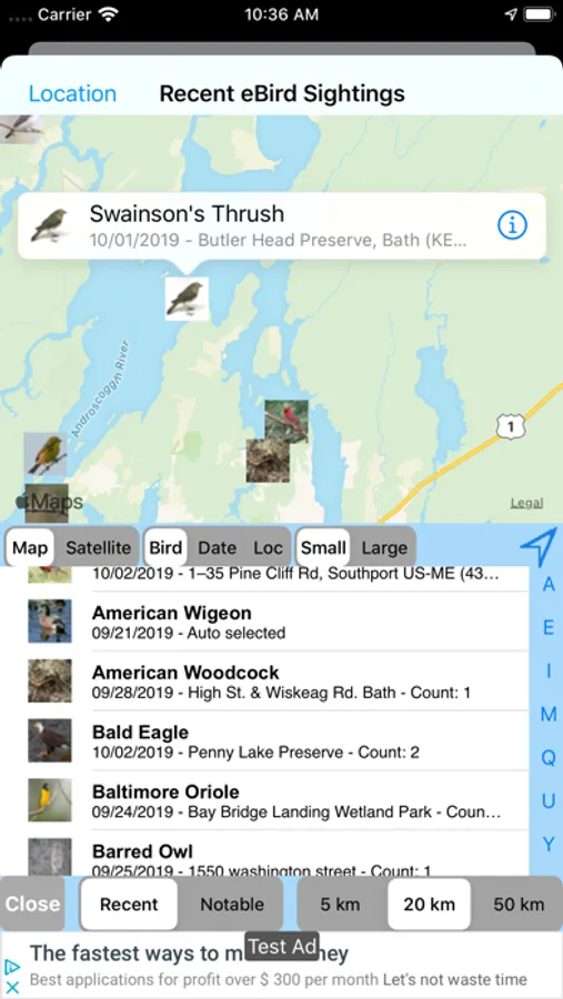 Out in the field or a vehicle? Tap the eBird Button and recent bird sightings in your vicinity. Another tap gives you directions to that recent sighting.