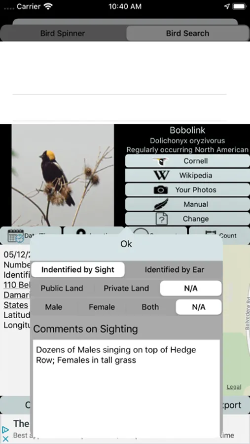 Identified the bird by ear? In the “comments” section, click on the “identified by ear” button and it will be noted. The same can be done with buttons for male, female, and to identify the setting as a public or private site. There is also plenty of space to enter your own comments. Tap the “count” button and scroll to quickly enter the number you have sighted.