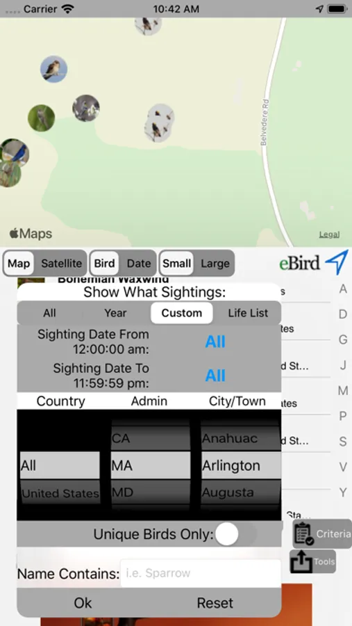 Big Year Birding is highly customizable. Set the app to display your sightings by date, location or bird. Choose to view all of your birds, those spotted on specific dates, by specific location or display your unique birds only. With one tap you can get your life list, your year to date list, your home state list, or review your sightings in previous years