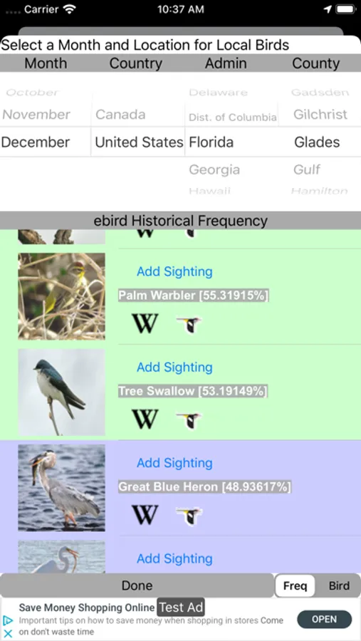 Not sure what bird you’ve seen, click the "Local Birds" Button and see what birds are historically seen in your current location (all USA counties, Canadian provinces and territories), by month. Helpful photos and sighting frequency plus links to on-line resources make identification a breeze.
