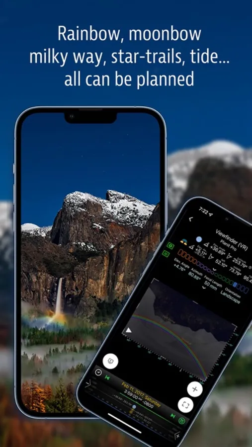 In the Planit Pro app, we packed it with features - from location scouting such as GPS coordinates, elevations, distance, elevation gain, clear view, focal length, depth of field (DoF), hyperfocal distance, panorama, and aerial photography, to the Ephemeris features such as the sunrise, sunset, moonrise, moonset time and direction, twilight time, special hours of the day, sun/moon finder, major stars, constellations, nebulae azimuth and elevation angle, star trail planning, time-lapse calculation and simulation, sequence calculation and simulation, milky way searching, solar eclipse and lunar eclipse, exposure/ND filter calculator, light meter, rainbow position prediction, tide height, and tide search, etc. All the information is either represented on the map as an overlay or visually presented in simulated viewfinders (VR, AR, picture, or street view), just like you look through your camera's viewfinder. Whatever you want for your landscape photography, it is there in the Planit Pro.