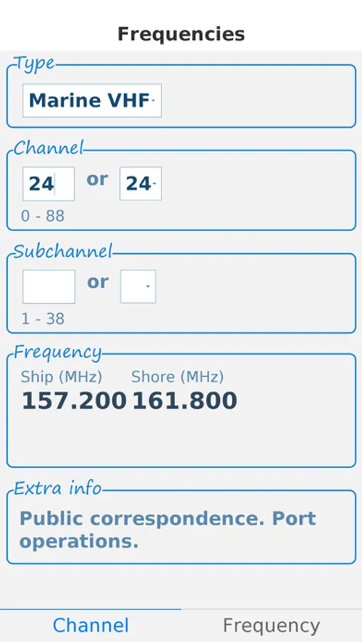 Select which type you need and select the channel and subchannel. The app calculates / converts the channel. The frequency (in MHz) and CTCSS frequency (in Hz) / tone code are then shown.