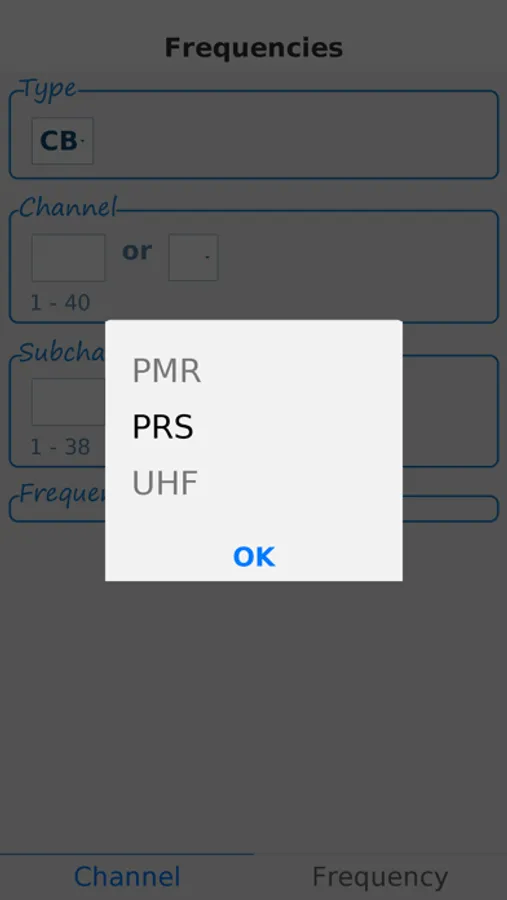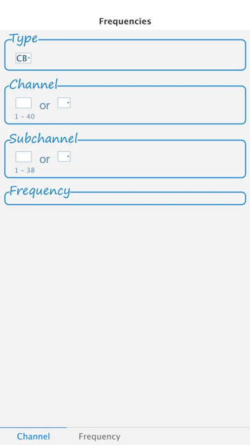 Select which type you need and select the channel and subchannel. The app calculates / converts the channel. The frequency (in MHz) and CTCSS frequency (in Hz) / tone code are then shown.