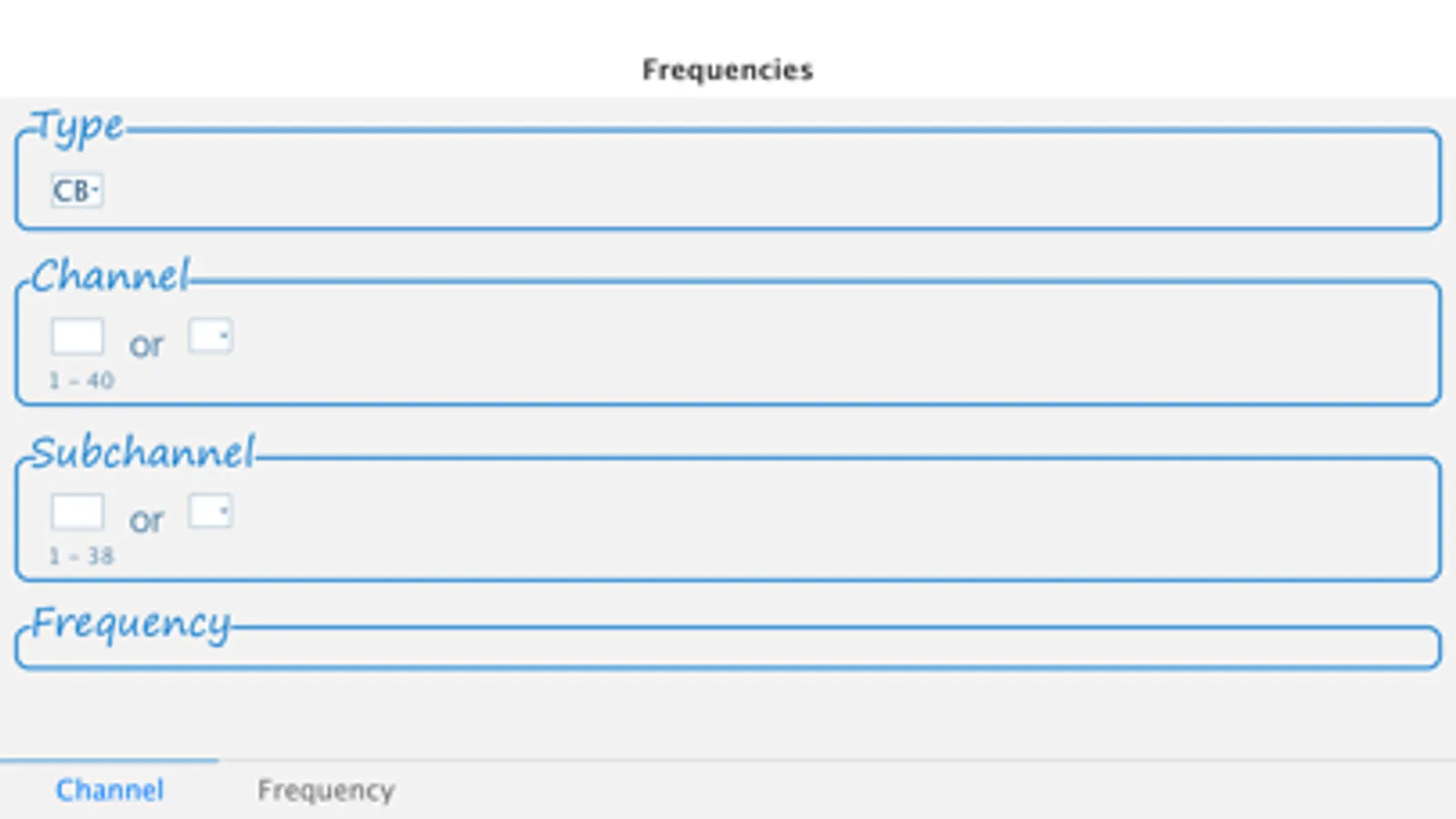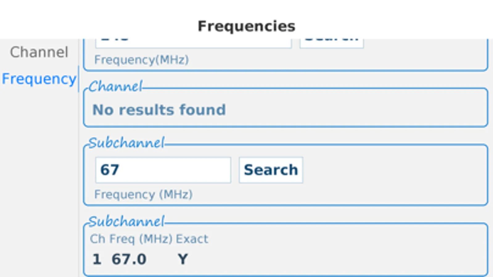 Or select the frequency (of a channel or subchannel) and the nearest channel will be shown, if it is nearby the given frequency. Select the tab 'frequency' at the bottom of the app to make use of this functionality.