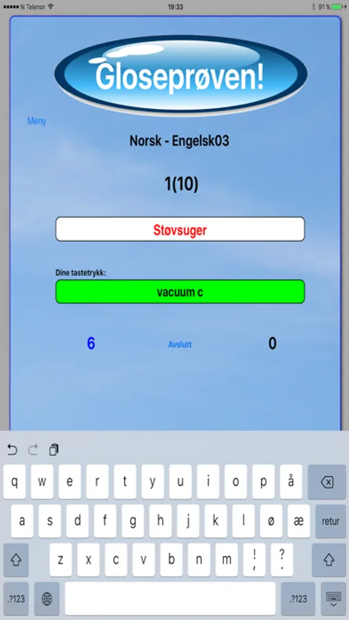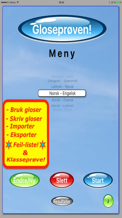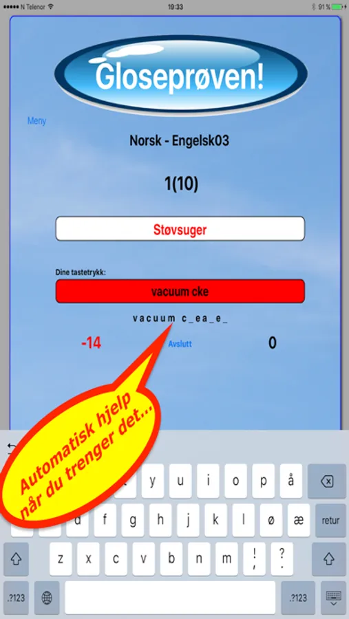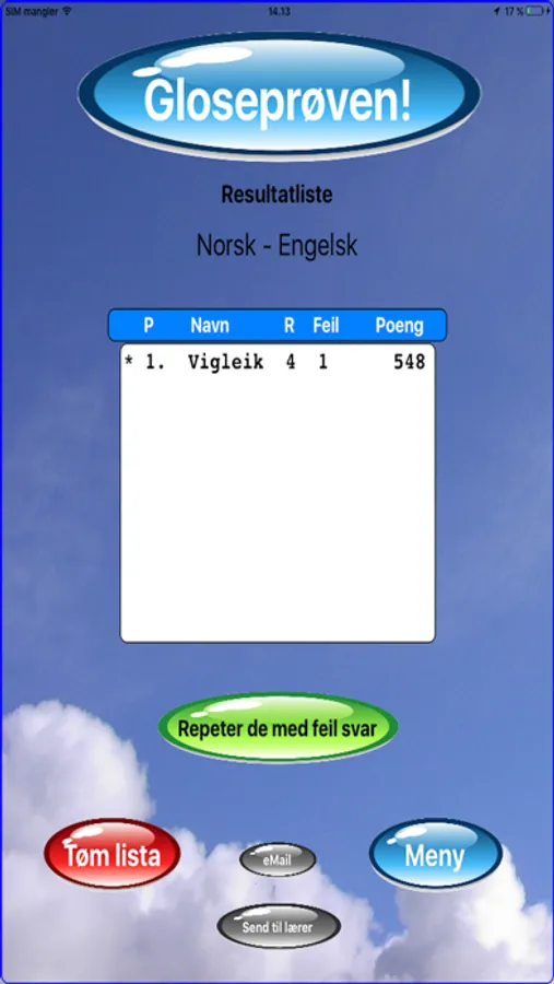 Straks prøven er sendt til læreren, får eleven se feilene i Feil-lista og kan jobbe med glosene til Feil-lista er tom; altså til elevene kan alle glosene i gloseprøven. Genialt!