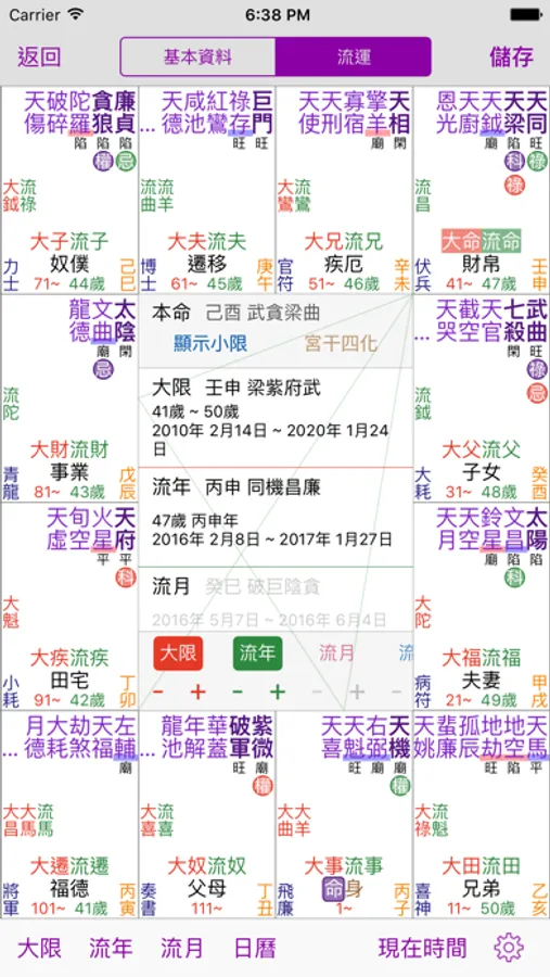 ‧ 獨有同時顯示「本命、大限、小限、流年、流月、流日、流時及宮干四化」的「星曜、流曜及四化」功能。