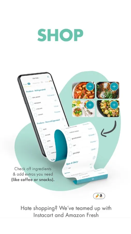 When you build a new meal plan, a grocery list of all the ingredients you'll need for the week is automatically created, and you can add extra things (like snacks or paper towels too!). Then simply grab your iPhone, check off what you already have, and efficiently zoom through the store - OR order your ingredients online via Amazon or Instacart and have your groceries appear at your door.