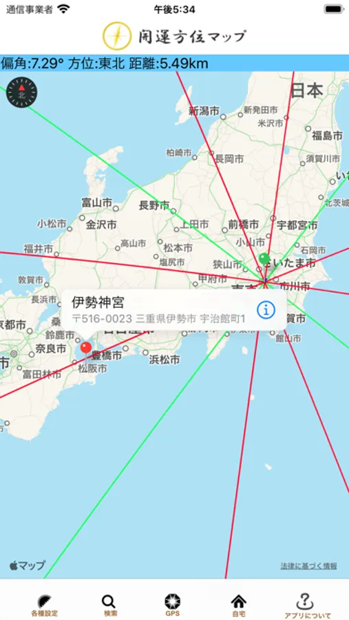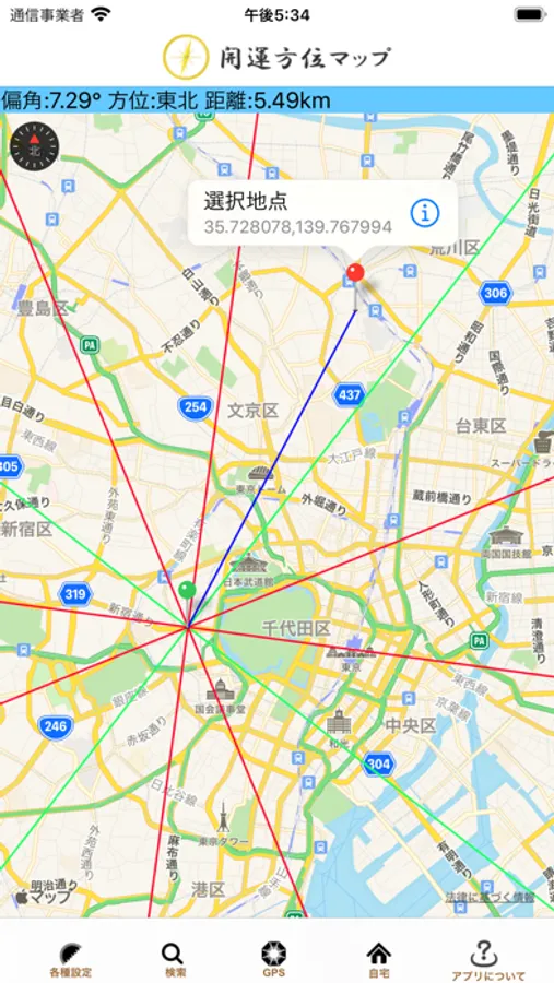 「開運方位マップ」は、占い(気学・奇門遁甲・風水)などで必要な、目的地への方位を確認できるアプリです。