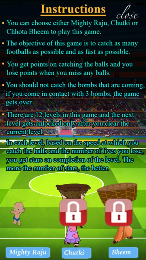 The game can be played using Mighty Raju, Chutki or Chhota Bheem. The latter two are unlocked only after you conquer certain levels.