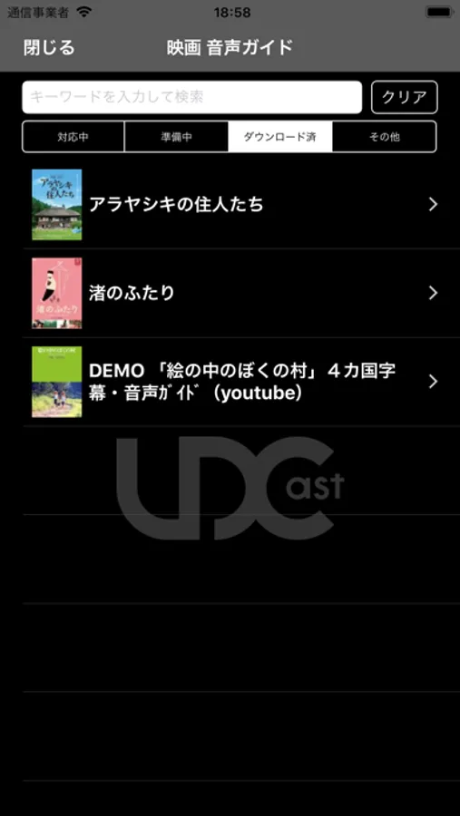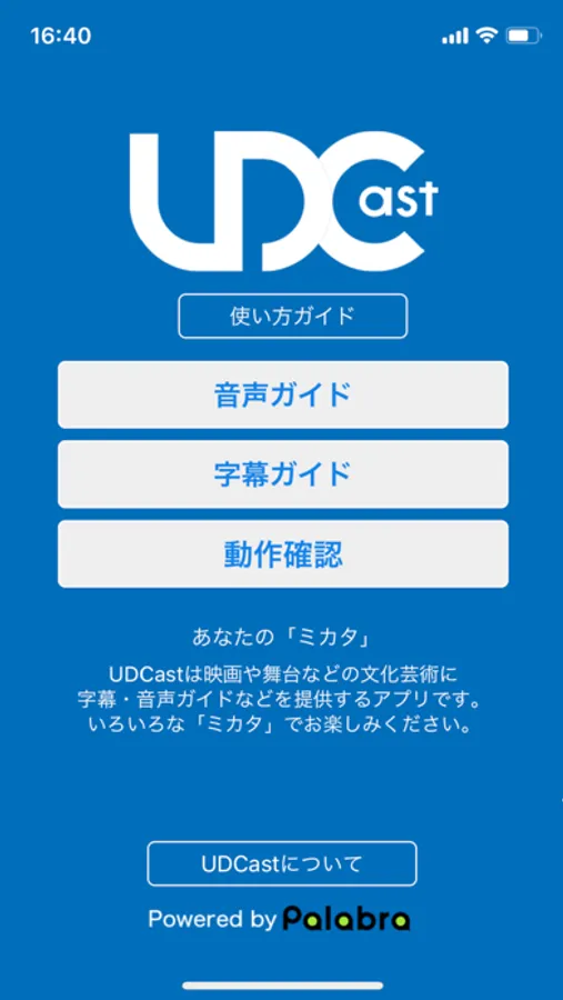 The UDCast app recognizes vocal information received through your device’s microphone, and displays captions and sign-language interpretation on your device’s screen. It can also output voice guidance through your device’s earphones.