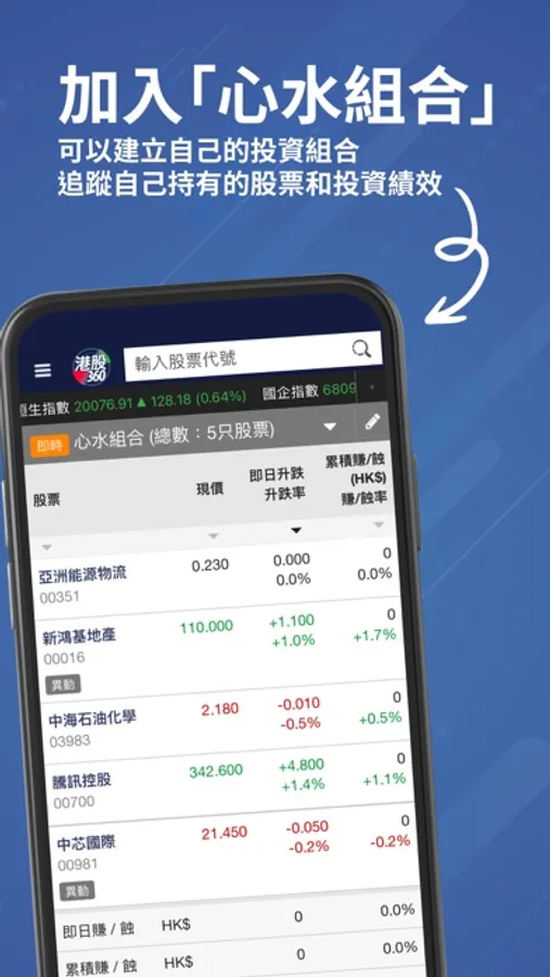 將心水股票儲存至組合,設定目標/止蝕、買入/賣出價,隨時查看組合即日/累積賺蝕表現,管理股票組合話咁易。