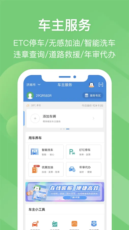 【更多车主服务】优惠加油,全国6000+加油站享满减优惠。车主服务提醒包,及时通知交规违法情况。年审代办,尊享VIP通道不排队。道路救援,出行无忧。ETC高速通行保,全国ETC高速公路都能保。