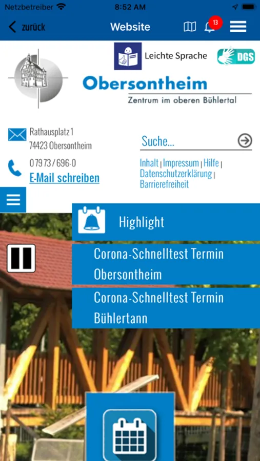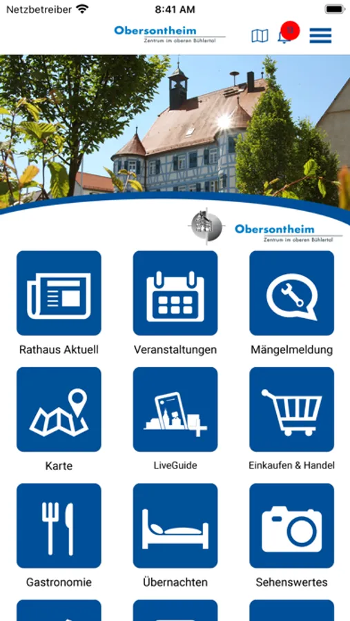 Mit der "Obersontheim-App" haben Nutzer alle Informationen "in der Tasche" und können Sie sich auch virtuell durch Obersontheim bewegen. Sie öffnen die App und rufen Bereiche wie News sowie die Lage von Sehenswürdigkeiten, Einrichtungen, Infrastruktur, Handel, Gewerbe, Gastronomie etc. auf.