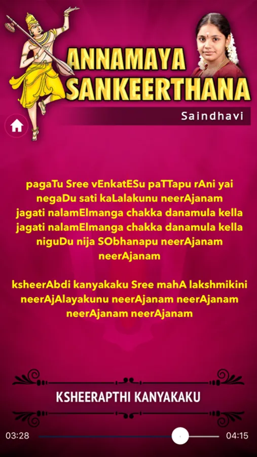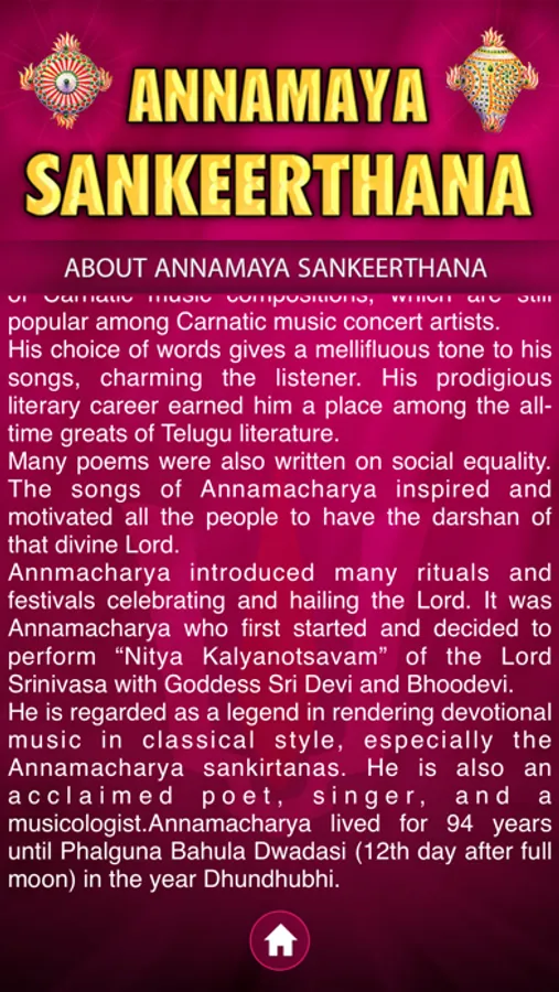 The Sankeerthanas of Sri Annamacharya, glorify Lord Venkateswara of Trimula. These strikingly beautiful composition describe the beauty of Lord Sri Mahavishnu.