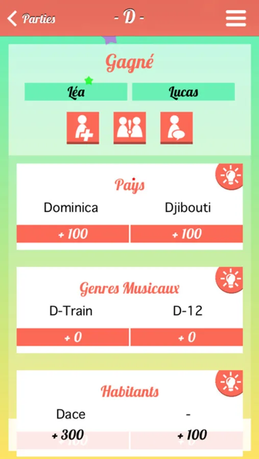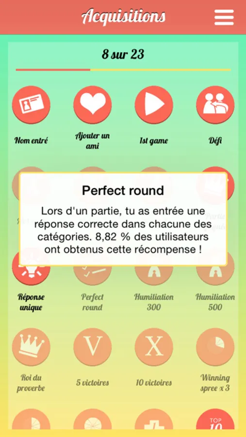 - Des récompenses, telles que "Perfect round" ou "Réponse unique"