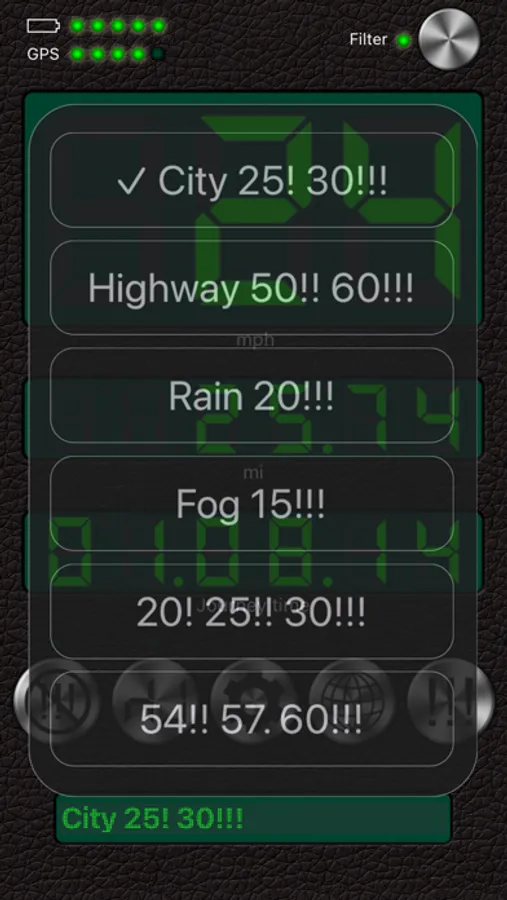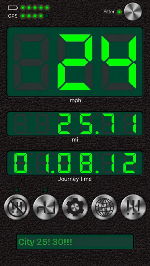 3. The G-meter. Get APPROXIMATE acceleration calculated based on your speed variation. Why use the GPS G-meter: no need to keep your iPhone in a fixed position or connect it to your vehicle’s computer system, which means speed readings can be taken discreetly, for example, during a test drive. Taking a number of readings compensates lesser accuracy. Acceleration is calculated only when the filter is off. Acceleration cannot be measured near tall buildings, in the mountains or woods.