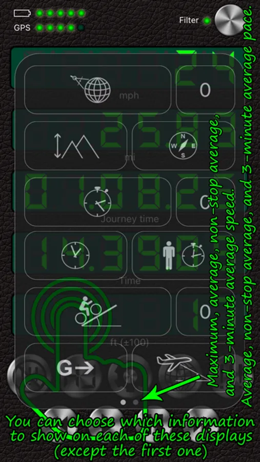 2. Speed data filtering. Readings with the filter on are more inert than those with the filter off though. THE FILTER MUST BE ON WHEN CYCLING, JOGGING OR WALKING.