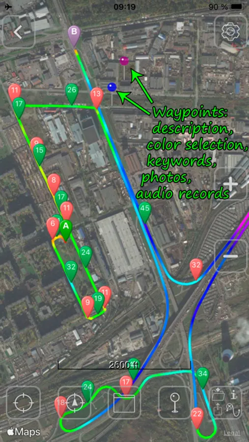 21. Waypoints (description, color selection, keywords, photos, audio records)