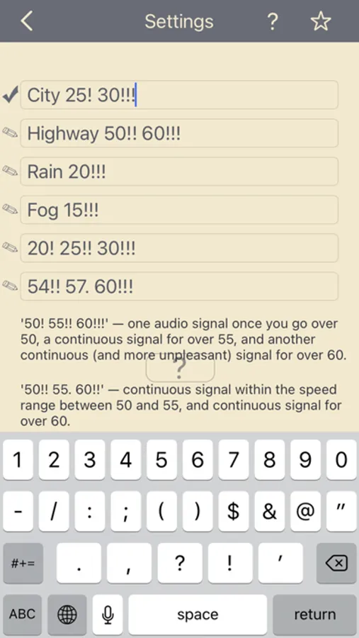 • "60! 70!! 80!!!": One audio signal once you go over 60, a continuous signal for over 70, and another continuous (and more unpleasant) signal for over 80.
