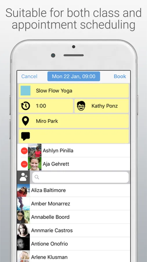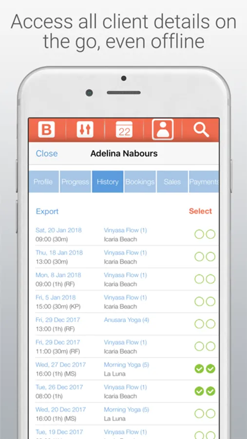 • Check-ins: Check-in your clients as they drop in your group class one by one. We measured it, and it only takes 5 seconds to check some in, including matching it with a class pass! This way you can get your class started on time.
