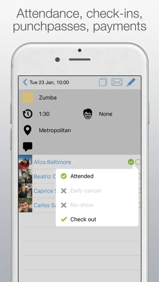 • Attendance: Mark a client as attended from your mobile device and the system does the matching with a purchased package. You can even mark all participants at once.