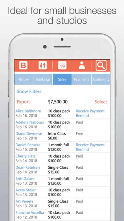 • Sales and payments: Define three kind of products: packages (multi-class), subscriptions (time-based) and retail (e.g. an energy bar or book). Then sell it to your clients and register payment on the spot or keep it open till later.