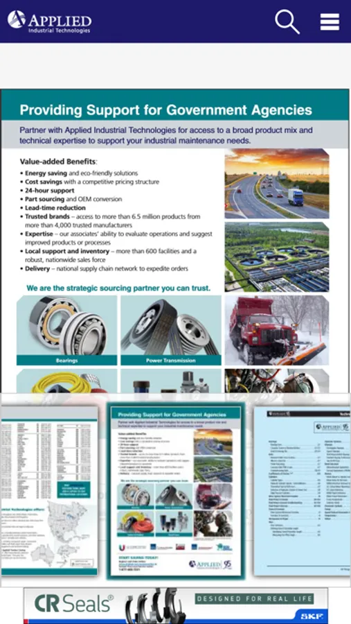 The Applied Industrial Technologies Product Catalog App gives you instant access to our 1,000+ page industrial supplies catalog, complete with full product details and specs, technical information, cross reference guides, product videos and more. This must-have guide features the most popular bearings, power transmission products, fluid power components, hose, tools, chemicals, lubricants, safety items, janitorial supplies and more. Simply Search, Click, Buy!